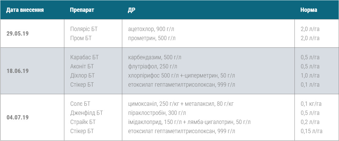Що стосується інсектицидної компоненти, вона теж потрібна. Частота інсектицидних профілактичних обробок залежить від погодних умов і зони вирощування. Для умов Полтавщини виявилося достатньо однієї обробки Страйк БТ (імідаклоприд + лямбда-цигалотрин). Цей комбінований високоефективний контактно-системний інсектицид широкого спектра дії з акарицидними та репелентними властивостями забезпечує швидкий ефект і тривалу захисну дію. Продукт не спричиняє резистентності у шкідників завдяки подвійному механізму дії, та за умов належного дотримання регламентів є безпечним для навколишнього середовища.