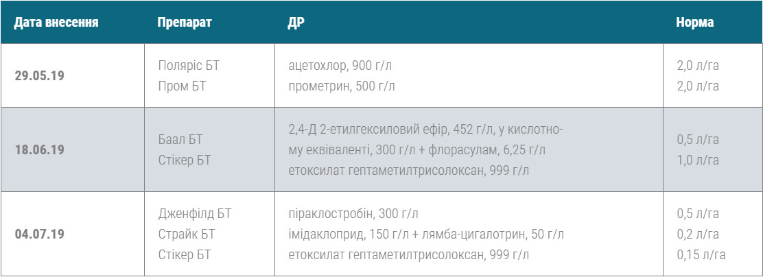 Компанія Ocean Invest пропонує застосовувати найбільш ефективні й перевірені на практиці діючі речовини. На демонстраційному полі були задіяні у баковій суміші Поляріс БТ (ацетохлор) у нормі 1,6 л/га і Пром БТ (прометрин) у нормі 2 л/га.